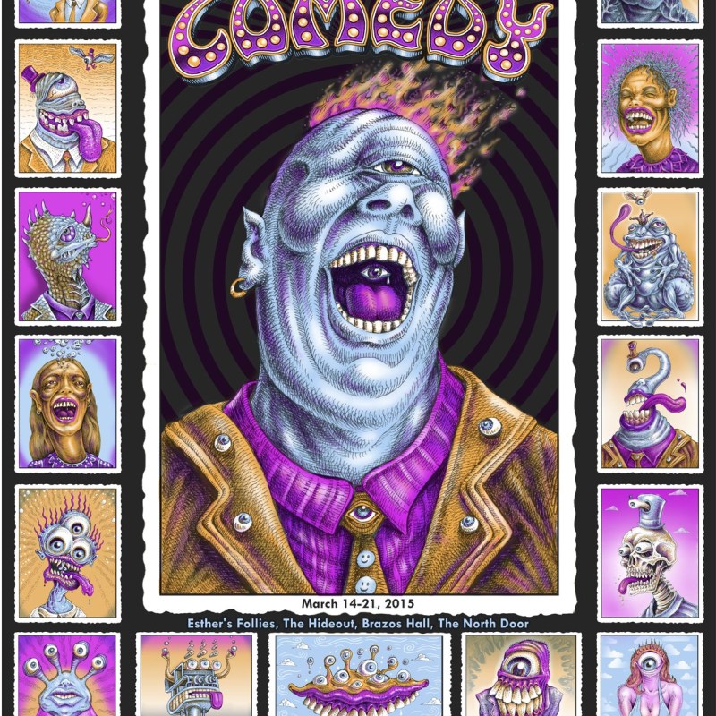 Every year, the SXSW Comedy Festival commissions a renowned artist to create a limited edition poster available to attendees, along with a special version exclusively for performers. Each includes the SXSW Comedy mascot (a frog wearing a jester’s hat) featured or hidden somewhere in the design. Click below for a closer look with downloadable PDFs.