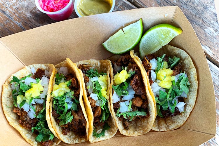 There’s only one kind of tiny taco here, a heavenly combination of pork, beef, and vegetables that’s cooked on a large disc-like wok (a.k.a. discada) and topped with cilantro, onion, and pineapple.