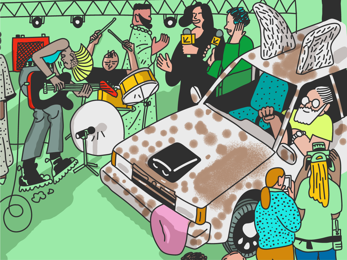 That was a journey. At first, my palette was much more subdued — sandy, limited, kind of quiet. I was just honestly encouraged to keep pushing. At a certain point I threw caution to the wind and I think that’s when it all sort of clicked; it just felt like a fit, the energy of the festival and the characters came more to life. Jann, one of the art directors, told me Austin’s actually quite green (I’d been picturing desert tones). So I started using this minty, cool green I’d been experimenting with in my personal work. I liked how it related to all the other colors and could complement skin tones, you know, or at least hint at skin tones.