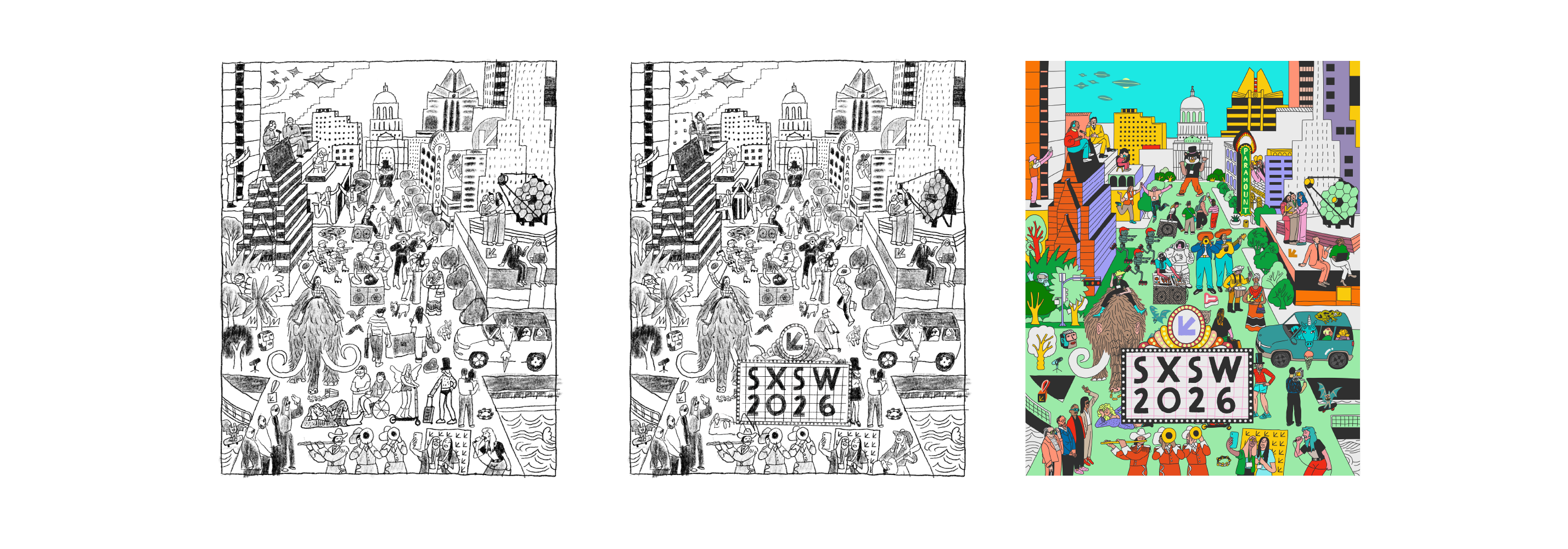 Josh Cochran: The art directors sent me previous identities and they were all very graphic. I was encouraged to just go hard, play with all different types of people, body types—you know, people wearing suits and then weirdos in cut-off jorts. I was sent some reference folders with images and I also looked through the archive. I spent a lot of time just combing through and trying to get a sense of South by Southwest because I’ve never been. And the more I looked, the more I understood what they were looking for, which was this kind of eclectic, wild, party-festival that’s happening in the streets and also in the buildings and all over Austin. It was a fun challenge to try to figure out how to mash everything together.